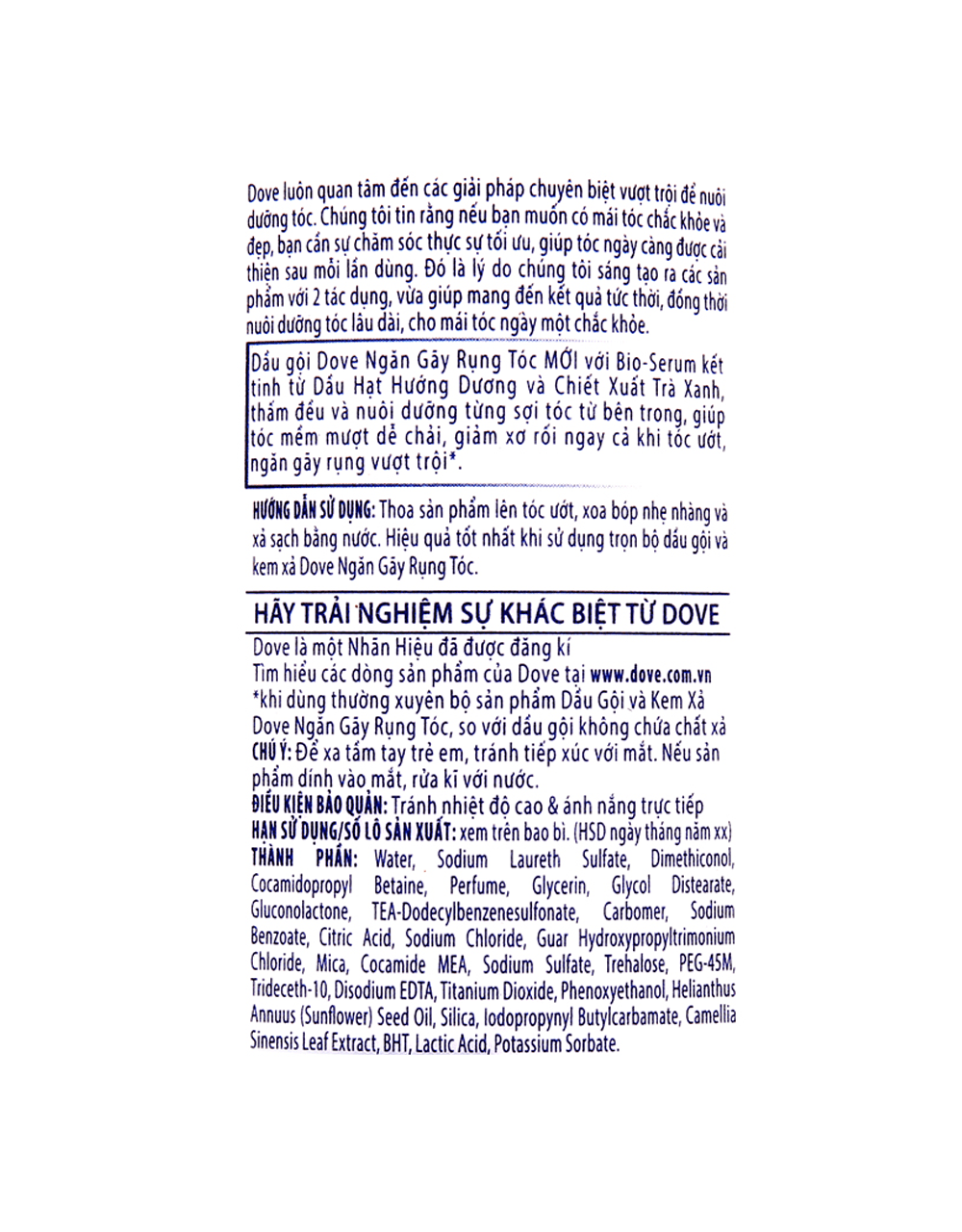 Dove luôn quan tâm đến các giải pháp chuyên biệt vượt trội để nuôi dưỡng tóc. Chúng tôi tin rằng nếu bạn muốn có mái tóc chắc khỏe và đẹp, bạn cần sự chăm sóc thực sự tối ưu, giúp tóc ngày càng được cải thiện sau mỗi lần dùng. Đó là lý do chúng tôi sáng tạo ra Dove Ngăn Tóc Gãy rụng: vừa mang đến kết quả tức thời, vừa nuôi dưỡng tóc lâu dài cho mái tóc ngày một chắc khỏe.