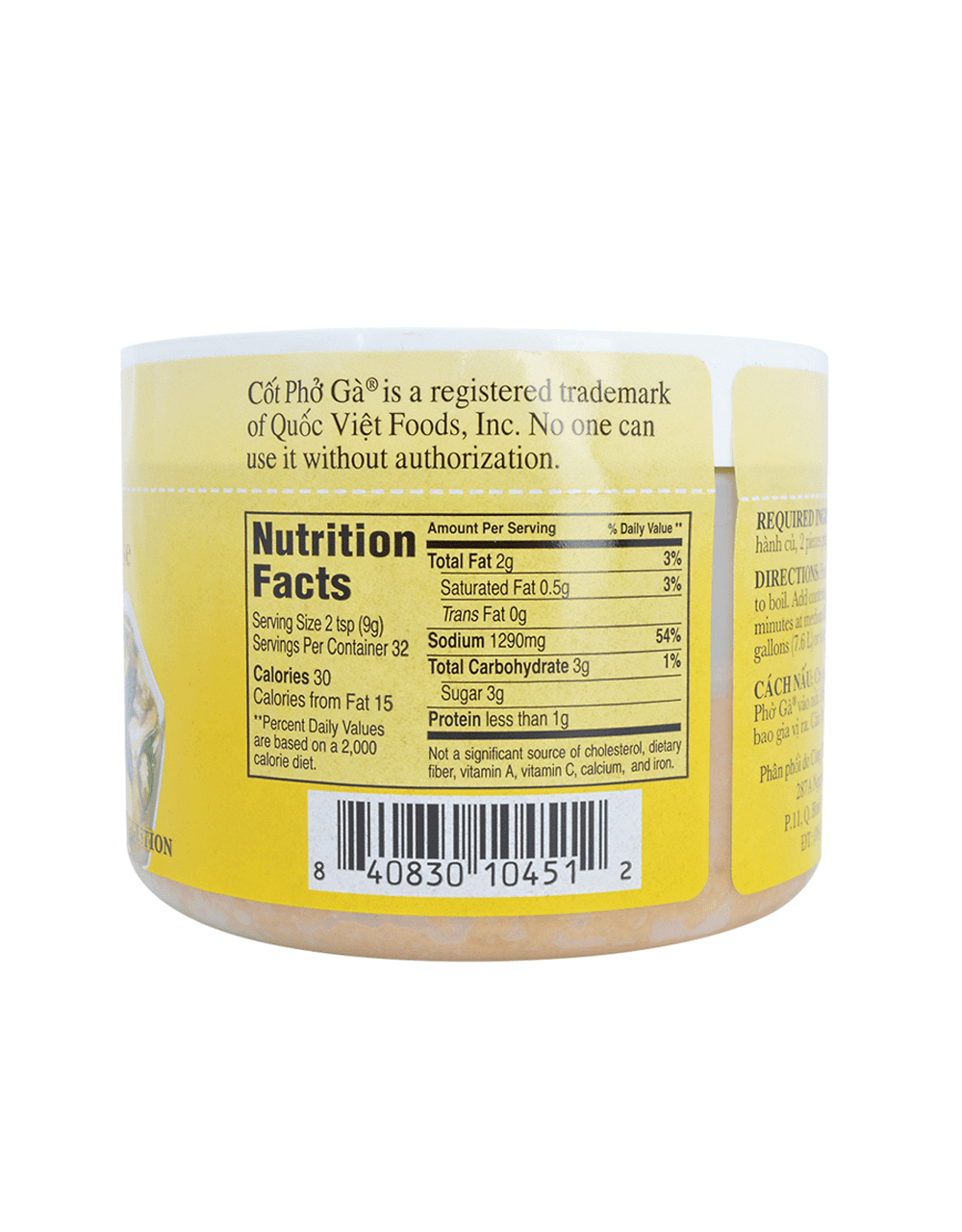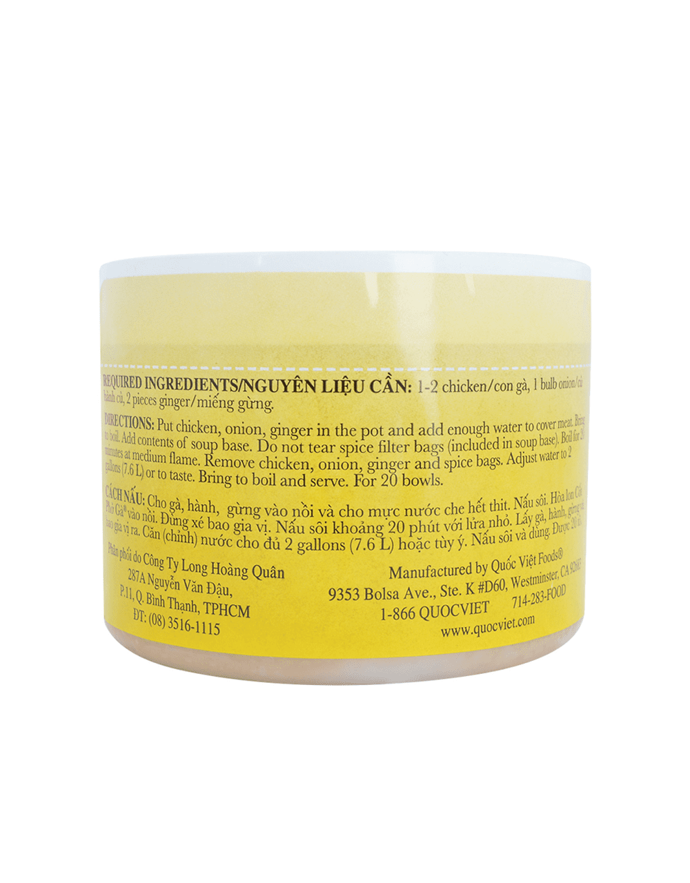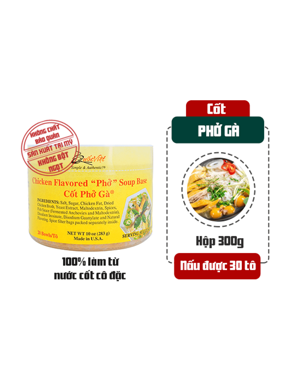 THÀNH PHẦN: Muối, đường, mỡ gà, nước luộc xương và thịt gà cô đặc, maltrodextrin, chiết xuất men, gia vị tổng hợp, nước mắm, chất điều vị, hương vị thiên nhiên. Gia vị đóng riêng trong túi. Hầm bằng xương và thịt. Xấy khô đặc. Không dùng chất bảo quản, không dùng bột ngọt mì chính. Dùng để nấu phở hoặc súp